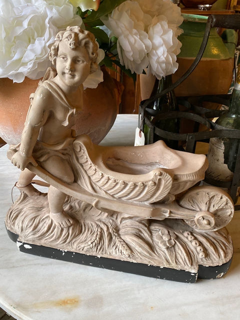 Antique French terracotta centerpiece jardiniere / statue figure of cherub with wheelbarrow