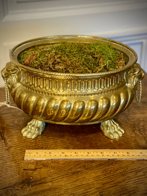 Vintage English mid 20th century brass shaped planter with ram head mount handles