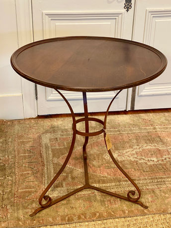 Antique French early 20th century wrought iron bistro table with round mahogany top